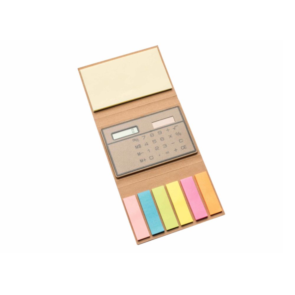 Set ecológico. Con estuche de cartón reciclado plegable. Calculadora Solar de diseño ultra delgado. 1 Taco Post-it (8.5 x 5 cm). 6 Señaladores Post-it de colores. Incluye aplicacion de logo.
